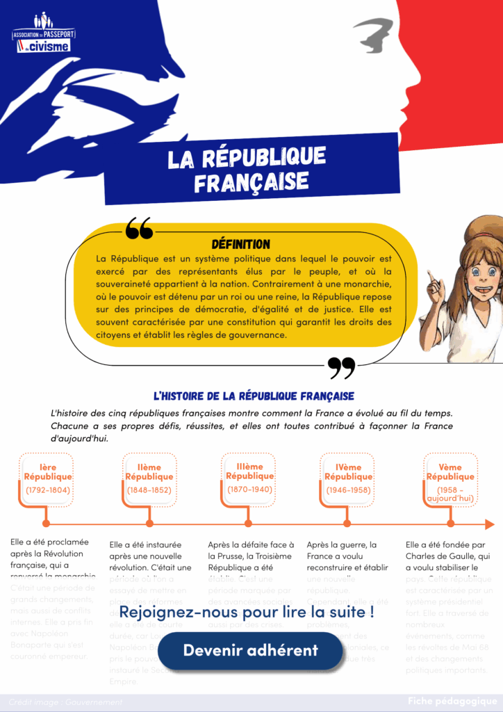 Les principes fondamentaux de la République française (énoncés dans sa devise) se traduisent par des droits intangibles, à la fois politiques et sociaux, qui ont été reconnus aux citoyens par les différents régimes républicains. Transmettre ces valeurs à la nouvelle génération est une action de première importance pour conserver l’identité de notre pays et favoriser un esprit de cohésion nationale.